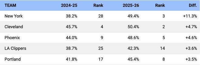 本赛季,全联盟三分出手占比从42.1%降至41.7%,30支球队中有16支出现下降。而在新帅迈克-布朗麾下,尼克斯队的涨幅断层领先联盟……